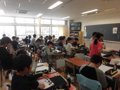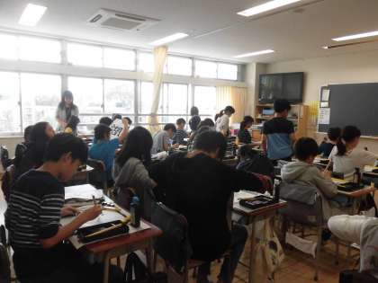 25日(木)の5・6時間目、6年3組は習字の時間でした。「湖」の一文字を練習しました。授業の後半に清書に入り、一画一画丁寧に書いていました。