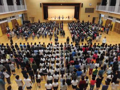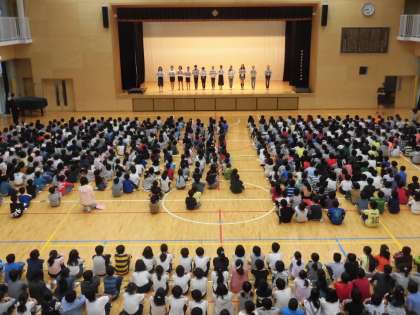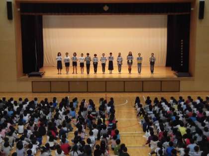 26日(金)の朝、体育館で委員会紹介集会を行いました。12の委員会の委員長がステージに登場しました。自己紹介と委員会の活動内容やお願いを伝えました。とても立派な態度でした。
