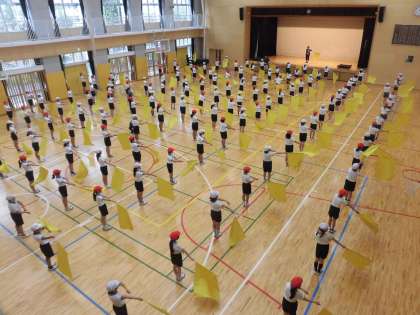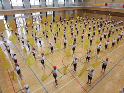 7日(火)の5時間目、6年生は体育館で合同体育をしました。今回は一人ずつ旗を手にして音楽に合わせて動かす練習をしました。腕の高さや旗を動かすタイミングがそろうととてもすてきです。