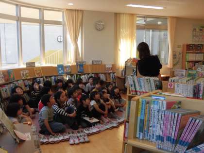 8日(水)の2時間目、2年3組は図書の時間でした。最初に「おまたせクッキー」の絵本の読み聞かせを司書さんにしていただきました。次々にお客さんが来る様子を子どもたちも喜んでいました。上履きを脱いでそろえることもでき、立派でした。
