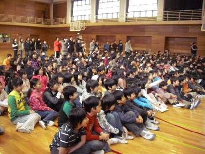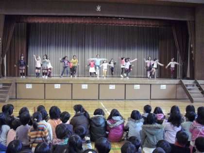 ダンスクラブの発表の様子です。新年親子お楽しみ会で発表しましたが、1年間練習してきたダンスをもう一度披露しました。休み時間にもかかわらず大勢の子どもたちが体育館に集合しました。