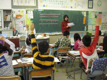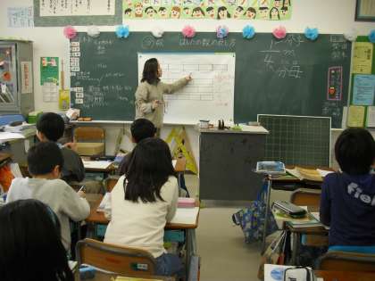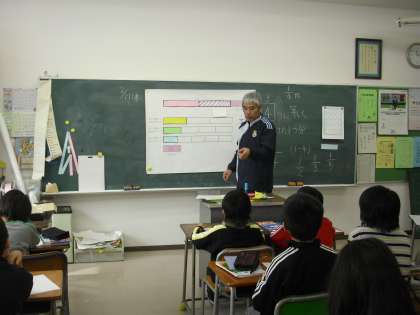 3年生の算数少人数指導の授業の様子です。分数を学習しているところです。新しい学習指導要領で3年生に移行した内容です。授業ではその導入を行っていました。分母の意味を図を使ってわかりやすく教えていました。
