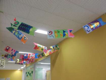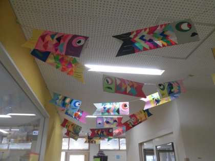 ひかり学級入口の天井にこいのぼりが登場しました。子どもたちの手作りです。うろこの色がとてもきれいで、目の動きが一人ひとり違っていて楽しいです。ずっと見上げていたくなります。
