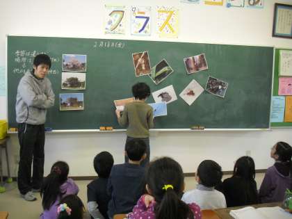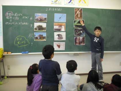 4年生の理科の授業の様子です。担任がランダムに黒板に貼った写真を、子どもたちが種類別に整理しているところです。桜の木、つばめ、カマキリに分類しました。桜の写真から写真が四季を表すことに気付いた子どもたち。つばめとカマキリの写真も同じように並べ替え、1年間の成長や変化について考えました。