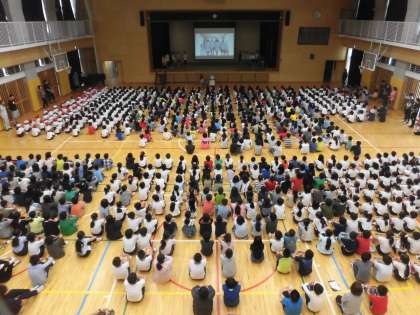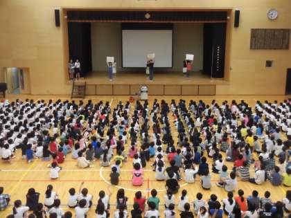 13日(月)の朝、体育館で給食委員会による発表がありました。給食の準備から片付けまでを写真で紹介しました。1年生にもよくわかる内容になっていました。最後に、給食に関するクイズを出題しました。3問目が4月に割れた食器の数でした。正解発表の際、「食器を大切に使ってください。」とメッセージを伝えることもできました。