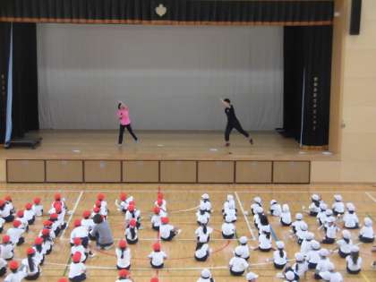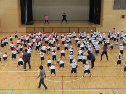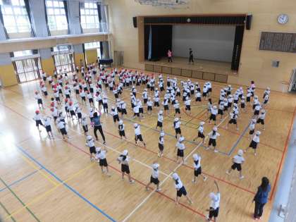 13日(月)の2時間目、1年生は学年体育の時間でした。団体競技「玉入れ」の前に踊るダンスの練習をしました。先生の踊りを見ながら、エビになったりカニになったりして楽しく踊っていました。