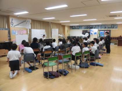 14日(火)の3時間目、6年1組は音楽の時間でした。「おぼろ月夜」の練習をしていました。歌詞カードが見えにくい人は、見える位置に移動して歌っていました。