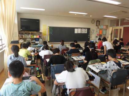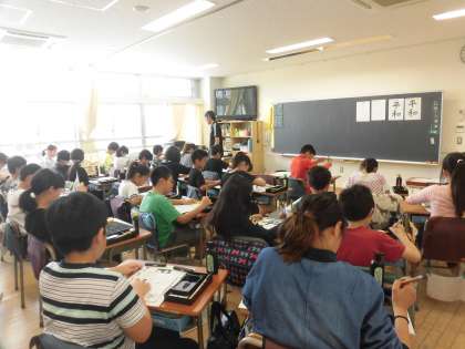 15日(水)の1・2時間目、5年4組は習字の時間でした。「平和」の二文字を練習しました。静かに筆を運ぶ姿がありました。