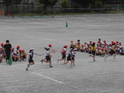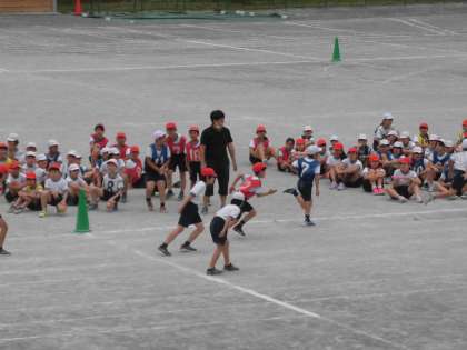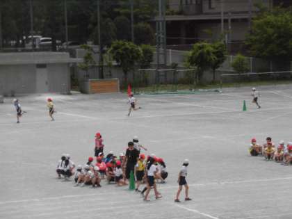 バトンパスの練習をしてから、実践編として実際にリレーをしました。コース取りや待つ位置など、次回への課題がわかりました。