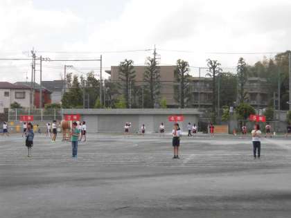 17日(金)の朝、プラカード係の5・6年生が校庭で練習をしました。赤組と白組に分かれてプラカードを持ち、行進します。入場と退場の位置確認をしていました。