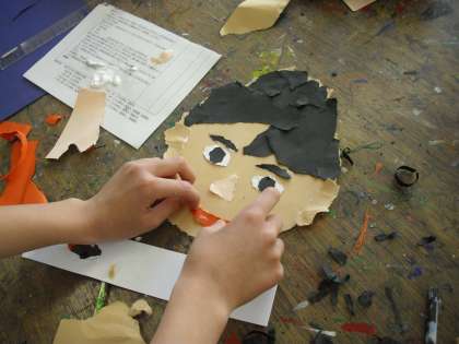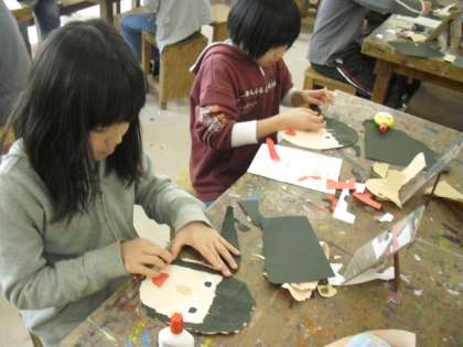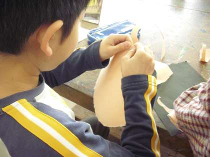 4年生の図工の授業の様子です。鏡を見ながら、画用紙で自分を表現しているところです。画用紙はすべて手でちぎります。顔が出来上がったら、体も作ります。走っていたり、手を振っていたりと好きな動きを表現します。