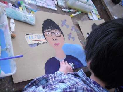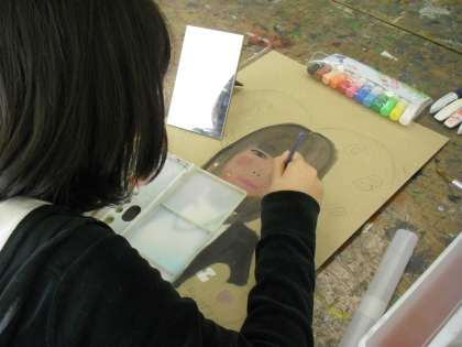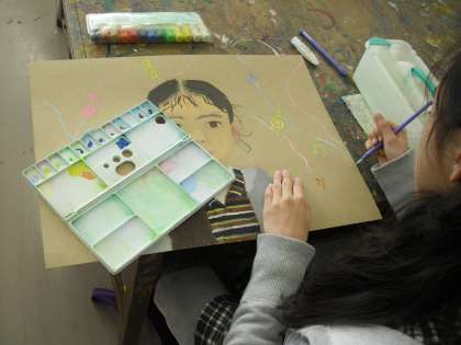 6年生の図工の授業の様子です。「12歳の自画像」の制作に取り組んでいるところです。肌の色も一色ではなく、光の当たり具合によって変化を付けています。色の混ぜ方や作り方も巧みで、これまでの学習の成果を感じます。