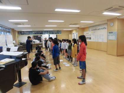 21日(火)の朝、合唱団の朝練習がありました。雨の日でも元気に参加しました。「山の朝」を歌って発声練習をしてから、「わたしはこねこ」の練習に入りました。ほほを高く上げることを意識しながら、数小節ずつに区切って練習をしました。