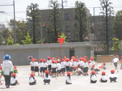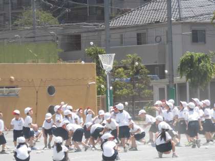 団体演技の練習後、「玉入れ」の練習に移りました。「エビカニクス」のダンスをしながら、かご目がけて玉を投げました。女子が投げるときは男子が応援し、男子が投げるときは女子が応援しています。
