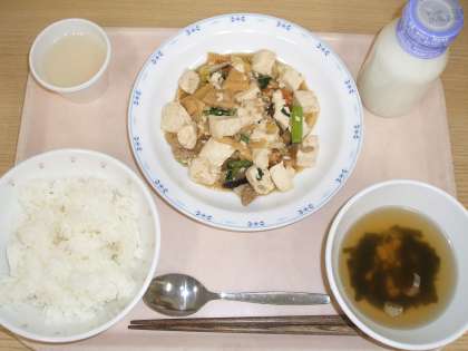 今日は、「豆腐の五目炒め」でした。一度にたくさんの食材を摂取できるのが特徴の一品です。今日は、10種類もの具材が入っています。たくさんの食材を使うことで、彩りもきれいに仕上がりました。