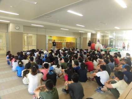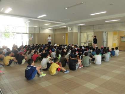 リハーサルを終えた5年生は1階のピロティに移動し、5年の先生の話を聞きました。「いつも2回目の踊りの方がいいと言われるが、本番は1回しかない。その1回をしっかり踊ってほしい。」「先生も120%の力を出すから、みんなも一緒に頑張ろう。」など、子どもたちにエールが送られました。