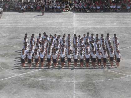 一人演技のあとは、二人演技に移りました。音楽と先生の吹く笛に合わせ、互いのつま先を合わせたり、手の指先を合わせたりしました。一つ一つの演技に拍手をいただきました。その後、集団行動に向けて校庭の中央に集合しました。