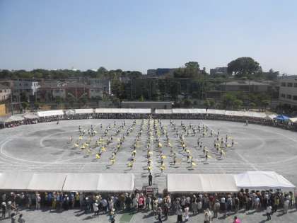 演技の後半になって黄色のフラッグが登場しました。最初は歌に合わせてのダンスです。一人ひとり曲に合わせて元気に踊りました。その後、別の曲に合わせて手にしたフラッグを上下左右、斜めにと力一杯振りました。みんなで心を一つにして振ったフラッグの音には迫力がありました。