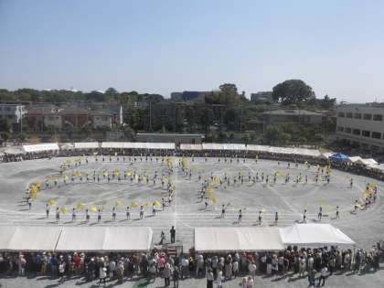 演技のときにほどよい風が吹いていて、子どもたちの後押しをしているようでした。隊形をクラスごとの円にしたり、放射状にしたりしながら見ている人たちを引き込んでいきました。フラッグの操作がそろい、青空に映えてとてもきれいでした。