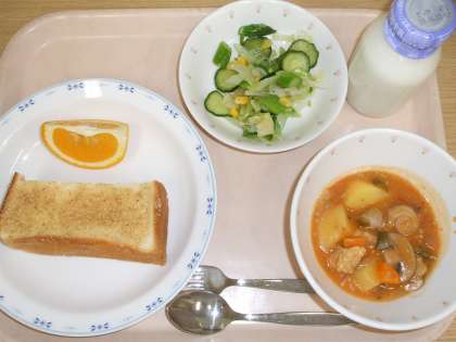 今日は、旬のアスパラガスを使ったサラダです。ドレッシングにはりんごとたまねぎを使用することでサッパリとした味付けになっています。また、ごまハニートーストはすりごまとはちみつ、バターを合わせたジャムを塗っています。