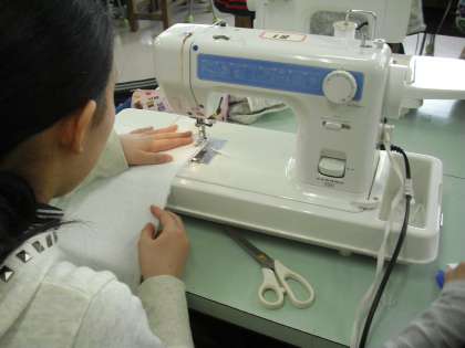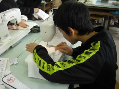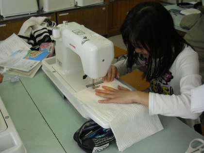 6年生の家庭科の授業の様子です。ミシンを使って雑巾を縫っているところです。黒板には「伝えよう ありがとうの気持ち」という単元名が書いてあります。誰に、何のために作っているのでしょうか?今は………秘密です。