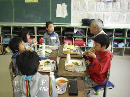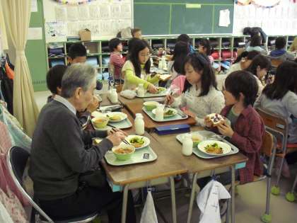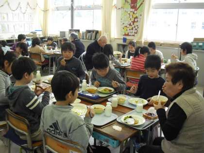 3年生のふれあい給食の様子です。今回は、都営第一八幡山団地自治会のみなさんにお誘いの声をかけたところ18名の方々が参加してくださいました。子どもたちとの会話を楽しみながら、一緒に給食を食べました。