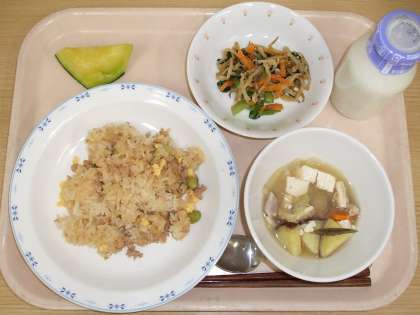 今日は青大豆を使った「豆そぼろごはん」です。そぼろと青大豆を一緒に調理したため、豆にもしっかり味が付いています。食べ応えのある一品でしたが、どのクラスでもモリモリと食べていましたね。