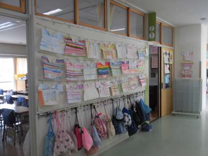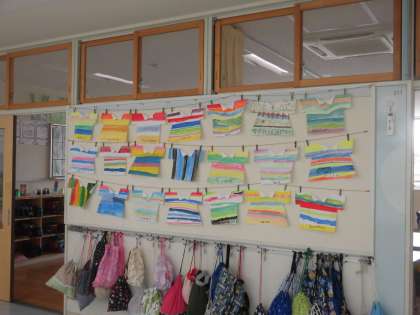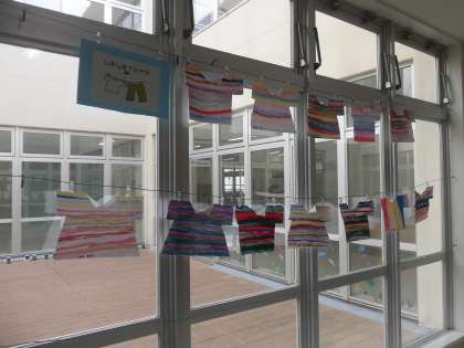 2年生の廊下には、図画工作の時間に取り組んできた作品が展示されています。題して「しましまTシャツ」です。縞模様が縦だったり、横だったりしていますが、色合いがそれぞれにすてきです。切れ込みの具合により、裾が開いていたり、真っすぐだったりして形も楽しめます。外側に折った白い襟がさわやかです。