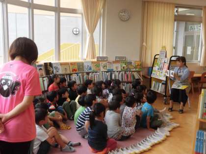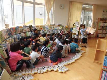 4日(火)の1時間目、1年1組は図書の時間でした。最初に、司書の先生が読み聞かせをしました。6月4日が虫歯予防デーということから、大きなワニが出てくるお話を選んでいました。子どもたちは上履きをそろえて脱ぎ、お話をよく聞いていました。
