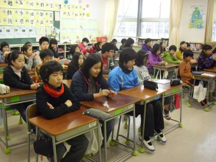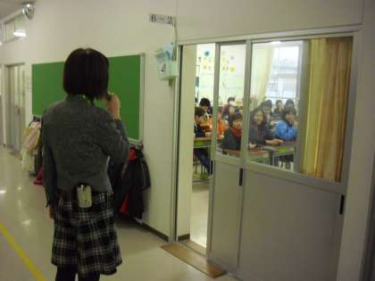 続いて6年生の感謝の会についての話です。マイクを持った渡部校長は1階から2階へ移動し、今度は6年生の教室の前で、文学館での感謝の会で地域の方々に心を込めて感謝の気持ちを伝えることができた6年生について褒めているところです。6年生にとってはサプライズでした。