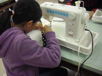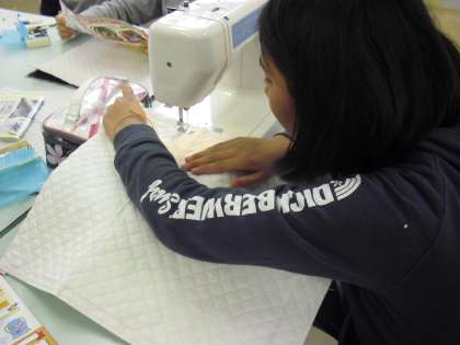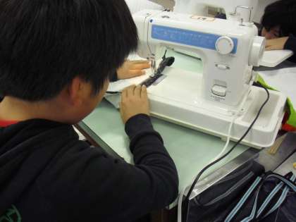 5年生の家庭科の授業の様子です。「縫って!使って!楽しい生活」の学習で、袋を作っているところです。ナップザック、トートバッグ、ボディバッグから選んで作成します。安全に気をつけながらミシンも慎重に操作しています。