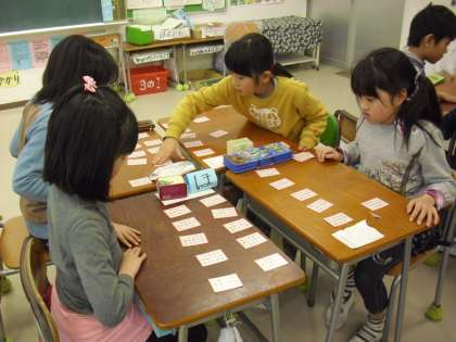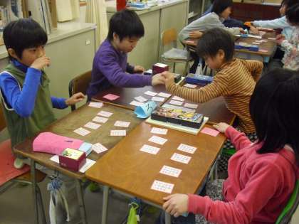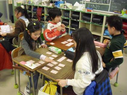 3年生の教科「日本語」の授業の様子です。百人一首に親しみ、楽しんでいるところです。担任が読み上げる上の句で、すばやく反応する子どももいます。二人一組なので、一人ひとりが十分に活動できます。