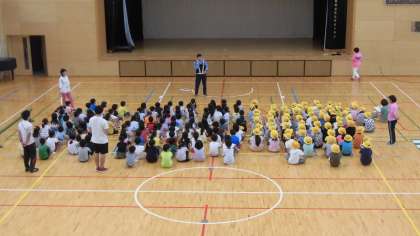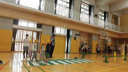 7日(金)の1・2時間目、1年生は交通安全教室に参加しました。警察署の方とPTA校外委員の皆様にお世話になりました。横断歩道の渡り方、塀に見立てた跳び箱の脇から広い通りに出るときの確認の仕方などをグループごとに体験しました。