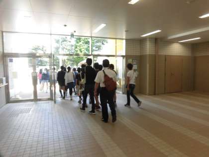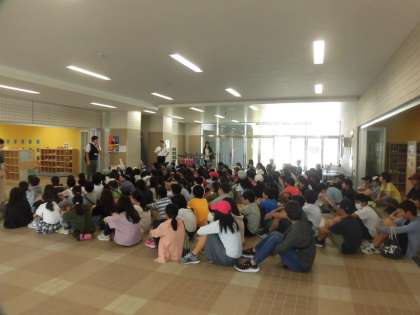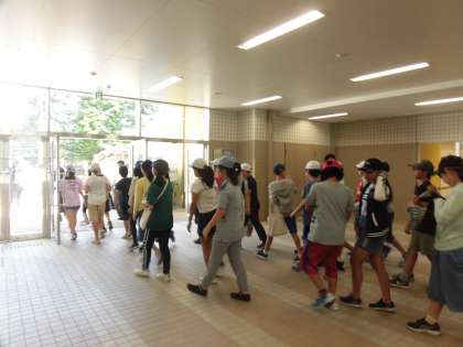 13日(木)の午前9時、6年生が1階ピロティに集合しました。烏山区民会館で行われる「古典芸能鑑賞教室」に参加するためです。狂言の「附子」を鑑賞します。午前9時10分、区民会館に向けて出発しました。