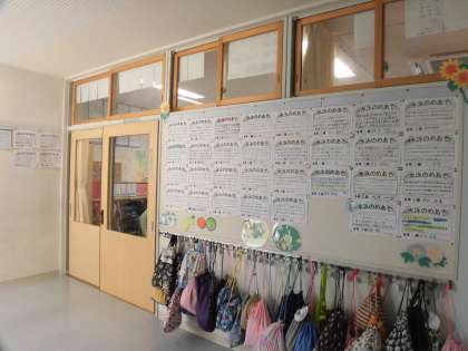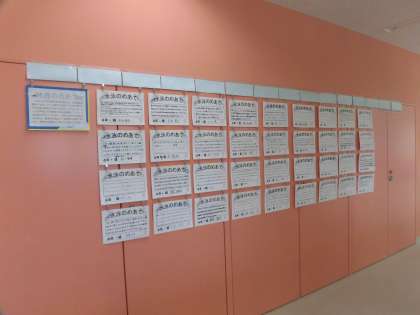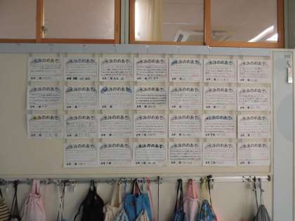 6年生の廊下には「水泳のめあて」を掲示しています。9月には6年生だけが取り組む「水泳記録会」があるので、小学校最後の水泳に臨む熱い思いが書かれています。