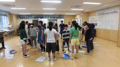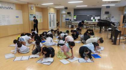 15日(土)の午後2時から合唱団の練習がありました。3時間授業後に下校してからの再登校です。雨の中を頑張って練習に参加しました。「わたしはこねこ」「青い竜」の2曲を練習しました。途中にゲームを取り入れてみんなで楽しむこともしました。合唱の基本となる姿勢や足の位置、呼吸法もペアの人と確認しています。練習で気付いたことは楽譜に書き込んだり、ノートに書いたりしています。