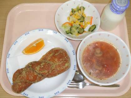 今日は「うぐいすきな粉」をまぶした揚げパンでした。普通のきな粉とは違ったうぐいす色のきな粉は見た目からも楽しめる一品です。また、ミネストローネやコーンサラダと並ぶと華やかな見た目に仕上がりました。