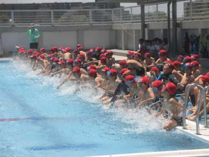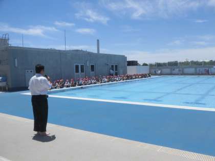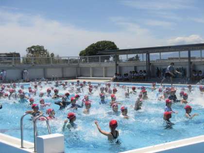 17日(月)から水泳指導が始まりました。校内のトップをきって、4年生が3・4時間目にプールに入りました。最初に、プール開きをしました。代表児童5人の言葉のあと、校長先生のお話がありました。準備運動、シャワーを浴びてから、いよいよ水の中へ。子どもたちからは大歓声が挙がりました。