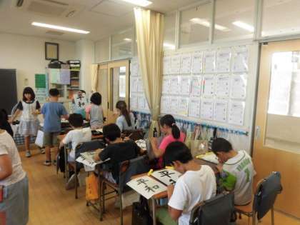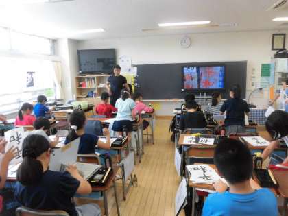 17日(月)の3・4時間目、5年2組は習字の時間でした。「平和」の二文字を練習しました。先生がお手本を示し、その後、子どもたちが書き始めました。