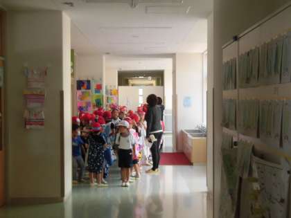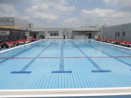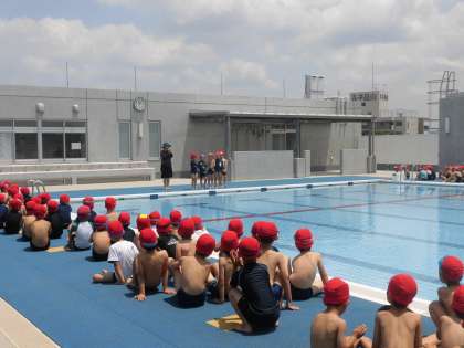 19日(水)の3・4時間目、1年生は体育の時間でした。小学校で初めての水泳の学習です。教室で着替え、廊下に並び、4階のプールまで移動しました。プールサイドに男女別にすわり、先生の話を聞きます。最初にプール開きをしました。クラス代表の子どもたちが自分の目標を話しました。