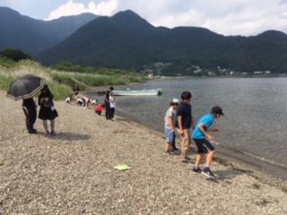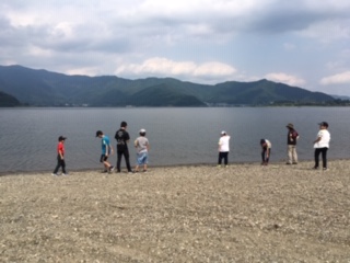 河口湖の湖畔に来ました。恒例の水切り、石投げ、石拾い。それぞれに楽しんでいます。