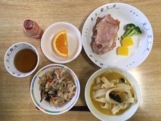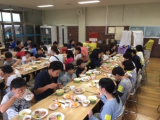 二日目の夕食です。炊き込みご飯にほうとう。美味しそうです。ソフトクリームを食べた後ですが、みんなしっかり食べていました。