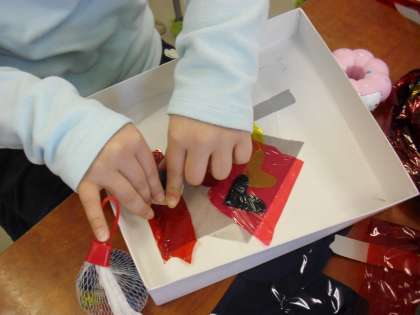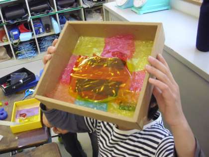 3年生の図画工作の授業の様子です。光と色のファンタジーの制作に取り組んでいるところです。箱に好きな形を切り抜いてセロファン等を貼り付けていきます。光にかざすと切り抜いた形が色とともに浮き出てきます。