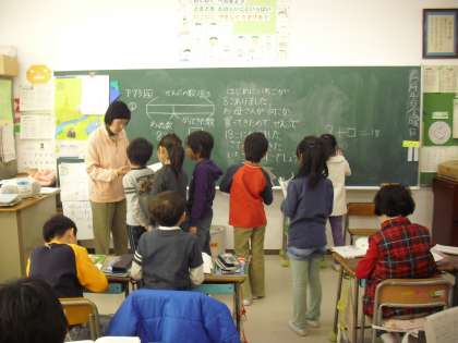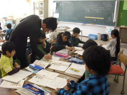2年生の算数の授業の様子です。学年を4つのグループに分けての少人数指導で授業を行っているところです。計算のまとめを行っています。かけ算九九を学習した2年生。しっかりと身に付けて次の学年に進級します。