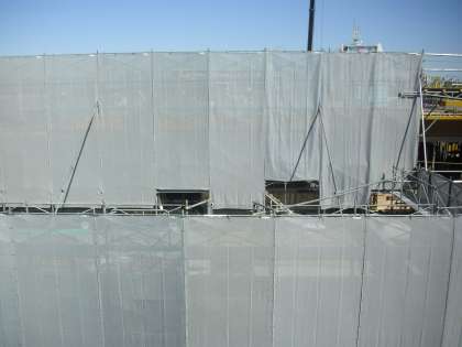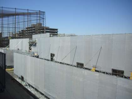 現在の新校舎建設工事の様子です。テニスコート裏の部分からほとんどシートに覆われていて中の様子が見えませんが、肉眼ではシートの裏でたくさんの方が働いている様子が確認できます。
