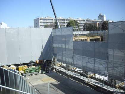 東側の体育館予定地、八幡山保育園棟もシートに覆われ、仮設校舎の窓からは工事の様子の詳細がほとんど見ることができなくなってきました。それだけ工事が進んでいると言うことです。
