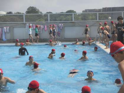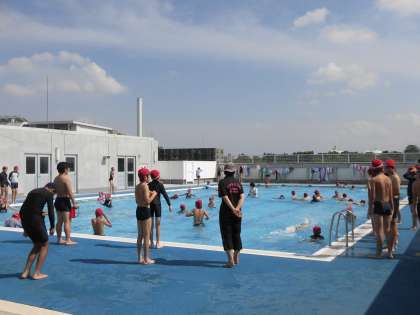 25日(火)の5・6時間目、6年生は水泳の時間でした。水慣れをしてから、25mを泳ぐ練習をしました。プールサイドにはクロールと平泳ぎの泳ぎ方ポイントが掲示されていました。子どもたちはペアを組み、互いにアドバイスをしあう姿がありました。