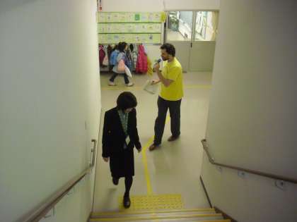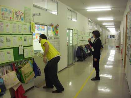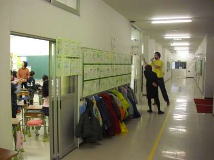 今朝の全校朝会の様子です。1年生から4年生までの英語活動の授業を行っていたALTのグリーン先生(通称エンキ先生)が今日で最後のため、渡部校長と一緒に各教室にお別れのあいさつをしました。
