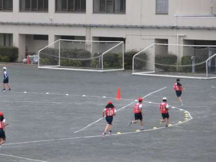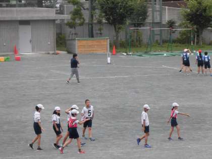 28日(金)の5時間目、6年2組は体育の時間でした。校庭で「リレー」に取り組んでいました。チームごとにビブスを着て、バトンパスのタイミングをつかむ練習をしました。最後に、実際にリレーをして、それぞれに振り返りをしました。