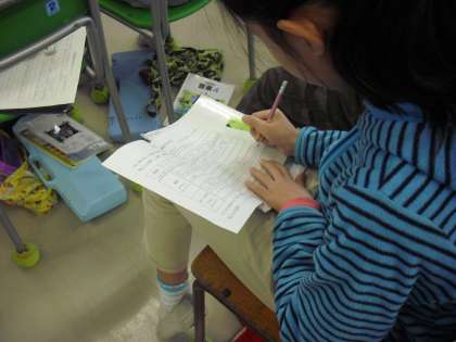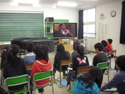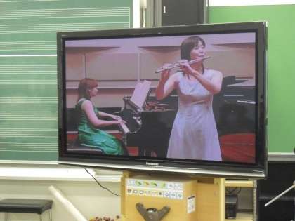 4年生の音楽の授業の様子です。鑑賞の授業で木管楽器の音色について学習しているところです。楽器のよってどのような感じがするかを考えます。映像では、木管楽器で「とんび」を演奏しています。聞き終わると、学習カードに感じたことを記入していきます。